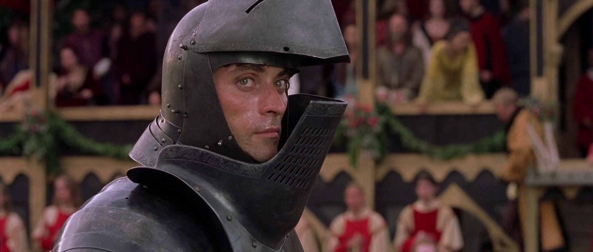 Анахронизмов полно и на уровне бытовых частностей: стрижка «сёрфер», кожаные штаны современного кроя, речовки английских фанбоев, поющих в тавернах перед стартом рыцарского чемпионата мира, гигантский макет London Eye, стоивший продюсерам 500 тысяч долларов, конферанс от Чосера перед поединками в духе комментаторских интро на MMA и даже лого Nike на доспехе.