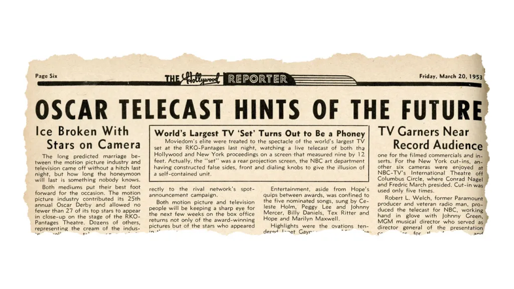 С 1950-х «Оскар» из-за экономических трудностей — закрытия кинотеатров и появления телевидения — начинает транслироваться по радио. А в 1953-м церемонию показывают по телеканалу NBC.