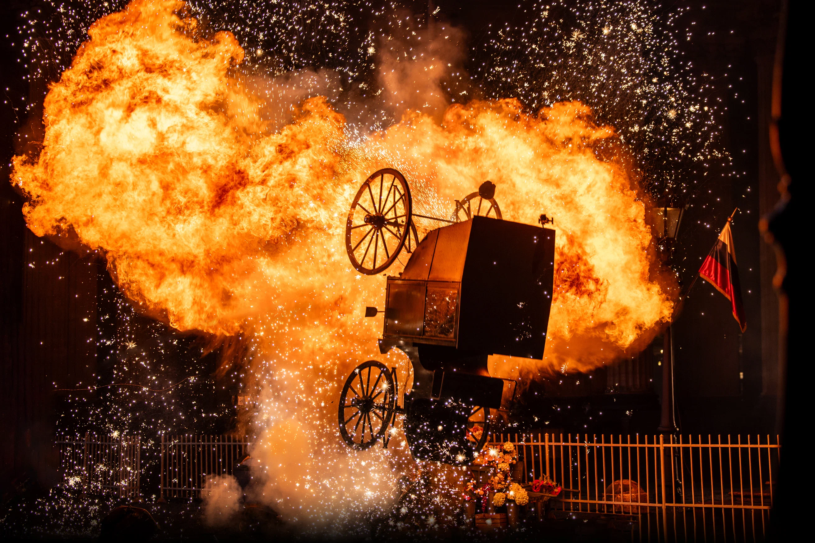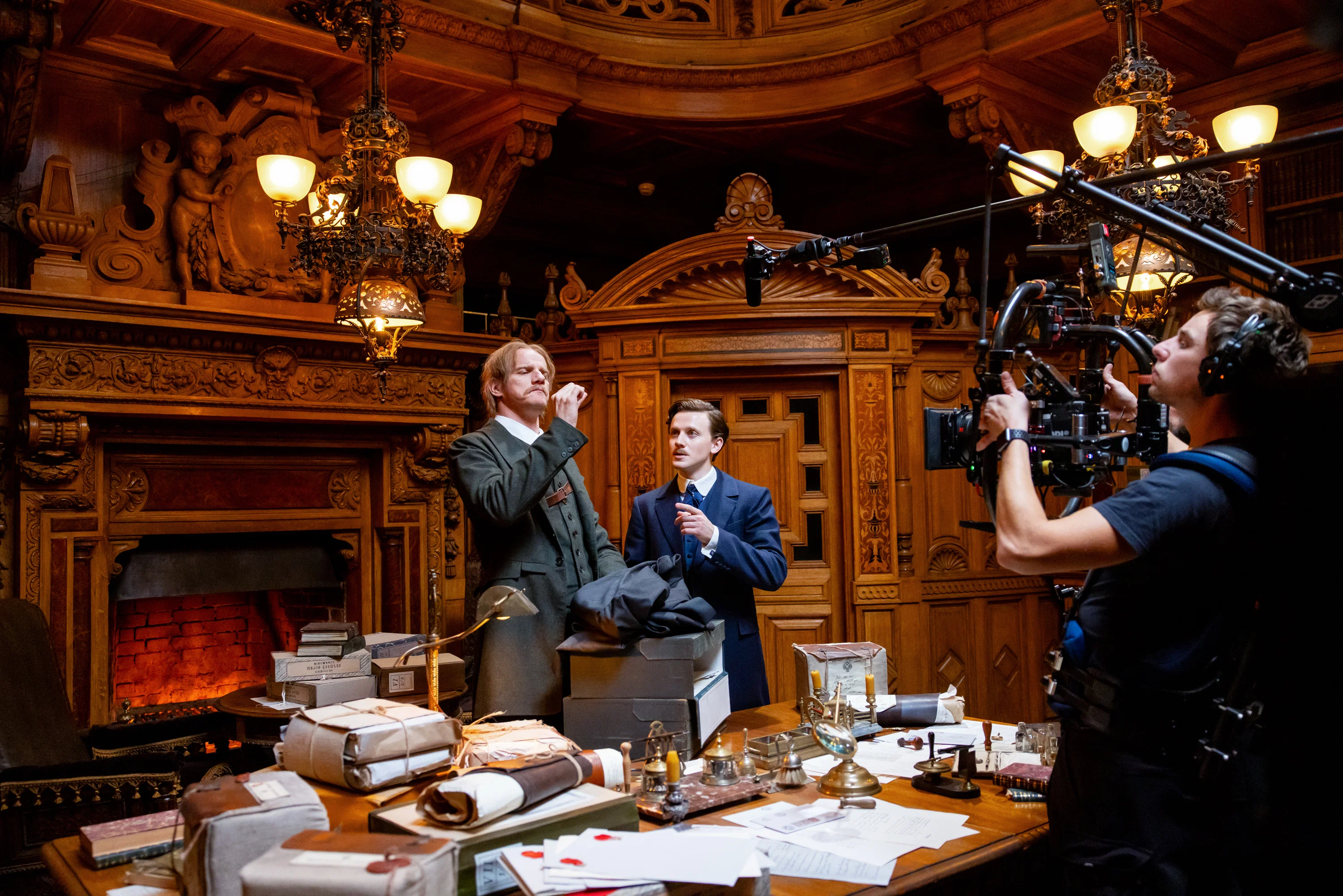 А вот на первом этаже здания — тишина. Подниматься наверх по массивной лестнице нужно строго на цыпочках, чувствительные микрофоны внимательны к каждому шороху. На лестничном пролёте переводят дух не задействованные в сцене актёры в исторических костюмах и члены съёмочной группы. Все неподвижны и затаили дыхание, рации выключены. «Стоп! Снято!» — доносится за стеной, разрешая присутствующим громко разговаривать и с шумом переносить реквизит из комнаты в комнату.