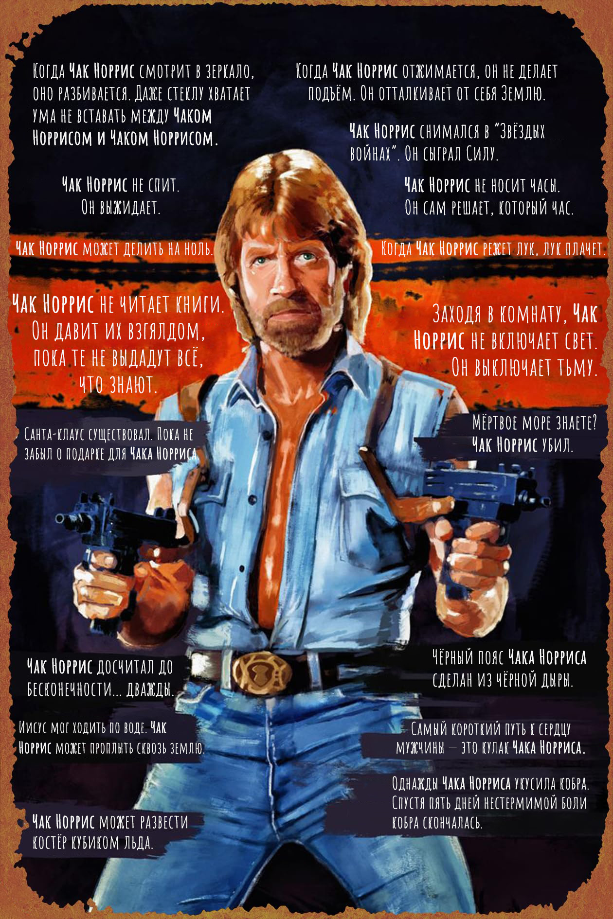 Знаменитые «Факты о Чаке Норрисе» стали чуть ли не первым мемом, с которого для многих и началось знакомство со всемирной паутиной. Тогда казалось, что этот перечень абсурда схватил за грудки саму ткань мироздания и перекроил её под форму Чакова подбородка. Шутки о том, что Чак заваривает доширак во рту и приходит в кошмарах к Фредди Крюгеру, сформировали мифологию целого поколения, опьянённого небывалой свободой информации.
